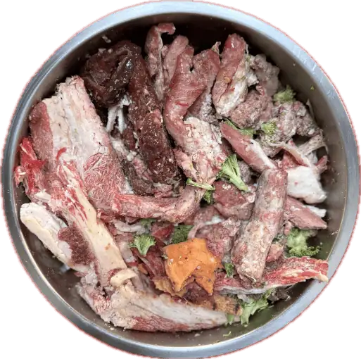 Beef Muscle Meat (80% Lean), Beef Organs (Heart & Liver), Beef Bone, Fresh Whole Vegetables (Broccoli, Carrots, Sweet Potatoes), Shell-less Hydrolyzed Egg Powder, Linseed Meal, Sunflower Meal, Tomato Pomace (Dry), Kelp (Dry), Choline Chloride, d-a-Tocopheryl Acetate, Manganese Sulfate, Zinc Sulfate, Vitamin A Supplement, Niacin, d Calcium Pantothenate, Vitamin D3 Supplement, Copper Sulfate, Riboflavin, Selenium Yeast, Biotin, Vitamin B12 Supplement, Pyridoxine Hydrochloride, Thiamine Mononitrate, Cobalt Carbonate, Folic Acid, Ethylenediamine Dihydroiodide